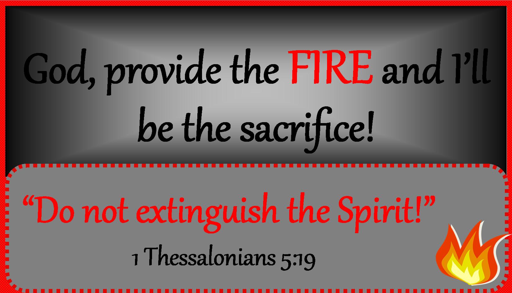 I don’t know about you but I tell the Lord; I’ll be the sacrifice as long as you provide the fire. See, God’s fire burns within us but it won’t burn us up. Oh, but it will burn up the stuff that means us no good. Why do you think your enemies can’t get close to you? Yea, they may stalk you on social media but that’s as close as they’ll get. Yea, they may text you but they can’t touch you! Why? They can’t handle the heat. God’s fire burns up the mess that is keeping you paralyzed in your current condition, it’ll burn up the anger that has held you hostage for so long and it’ll burn up the negativity that keeps seeping into your spirit. So, stop trying to put it out and instead add some spiritual wood to it. Wood = prayer, fasting, studying God’s word, working for the Kingdom, etc. Child of God, allow the fire of the Holy Spirit to burn within you. Pray, daily, for God to allow the Holy Spirit to fall on you! Then you’ll be like the men who were in the upper room on the day of Pentecost. For the bible says in Acts 2:1-4, “When the day of Pentecost came, they were all together in one place. Suddenly a sound like the blowing of a violent wind came from heaven and filled the whole house where they were sitting. They saw what seemed to be tongues of fire that separated and came to rest on each of them. All of them were filled with the Holy Spirit and began to speak in other tongues as the Spirit enabled them.” I don’t know what the fire of the Holy Spirit will give you, it may not be the ability to speak in tongues but it will give you a fire that you wouldn’t want to put out! God, I’ll be the sacrifice if you provide the fire!