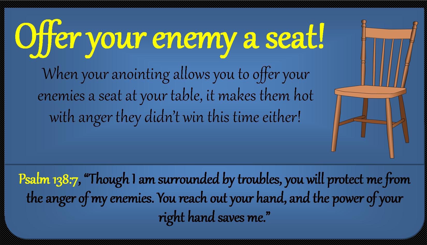 What do you do? Keep walking in God’s way and using your gift. Stop worrying about what folk say because there’s only fifteen dedicated folk in your congregation, your book doesn’t have as many reviews as theirs, your car is over ten years old, you haven’t upgraded your house yet, you’re still unmarried, your children didn’t go to college, your spouse isn’t like theirs and your event didn’t sell out. Stop focusing on why you keep bumping into naysayers or folk with the look of ‘I told you so’ in their eyes. Don’t put too much stock into those who make it their mission to knock you off your mission because God has granted them front row access but they can’t harm you, all they can do is look. For my bible tells me in Psalm 138:7, “Though I am surrounded by troubles, you will protect me from the anger of my enemies. You reach out your hand, and the power of your right hand saves me.” So be nice to those who wants to see harm come your way, be kind to those trying to make you stumble and smile at those who only say mean things about you because the bible says in Proverbs 25:22, “In doing this, you will heap burning coals on his head, and the LORD will reward you.” Beloved, when you don’t entertain the enemies, it makes them burning mad they didn’t get you. And when your anointing allows you to offer them a seat at your table, it makes them hot with anger they didn’t win this time either. Let them sit, they have no authority!