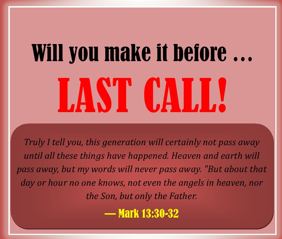 “Last call!” This is usually what you hear in a restaurant and/or club not long before the bar closes. This is to ensure you get all the ‘spirits’ you need before closing time. Now, when the Holy Spirit gave me this word, early this morning, I didn’t understand at first. Yet, as I laid there and allowed it to soak within me, this is what I got.