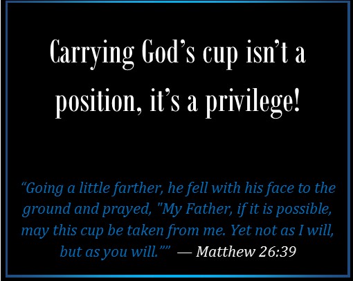 Well beloved, we all have a part in carrying the cup of suffering. Will it sometimes get heavy? Yes. And it’ll come with days of wanting to give it back but God chose you. From amongst millions, He chose you. From the rocks He could make cry out, He chose you. From the past that could have shut your eyes and mouth, He chose you. From your bed of sin, He chose you. Out of all He could have used, He chose you! So at some point in your life, you have to tell the Lord, “Use me until you use me up!” Get to a place where you say like Jesus’ words of Matthew 26:42, “My Father! If this cup cannot be taken away unless I drink it, your will be done.”