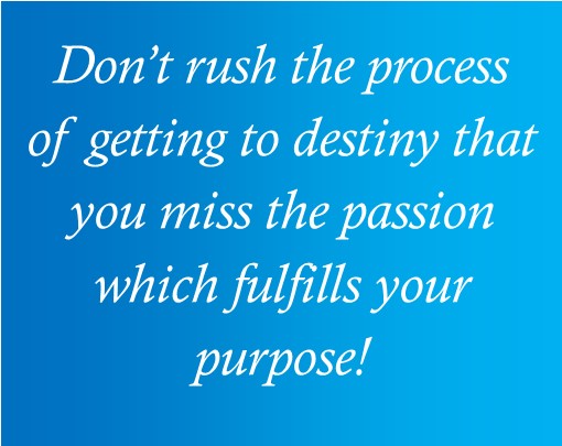 Amen!! Amen!! Let us not rush the process of getting to destiny that we miss the passion which fulfills our purpose!! So True!! God Bless!!