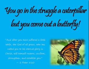 A butterfly begins as a small egg, however, instead of being born as a baby butterfly, it begins as a caterpillar. At birth, the caterpillar’s only responsibility is to eat and they eat in abundance because it helps them to grow. Once they are done and reached their full weight, they hang themselves upside down, spins itself into a hard shell called a chrysalis and stays there. Inside of this hard shell, metamorphosis is happening because the caterpillar is shedding its old body and the markings of a butterfly are appearing. On the outside, all you will see is a hard shell of something, hanging from a twig but inside, some stuff is going on. Finally, when the caterpillar has done all it can, the butterfly will begin to emerge from the shell. If you happen to be watching the process, you will see the butterfly struggling to get out. Get this though, the butterfly has to struggle because the struggle causes blood to be pumped into their wings which are soft and without the struggle, the butterfly would not have the strength to fly. If you try to help it out of the shell, you risk damaging their wings, preventing them from being at their full potential.