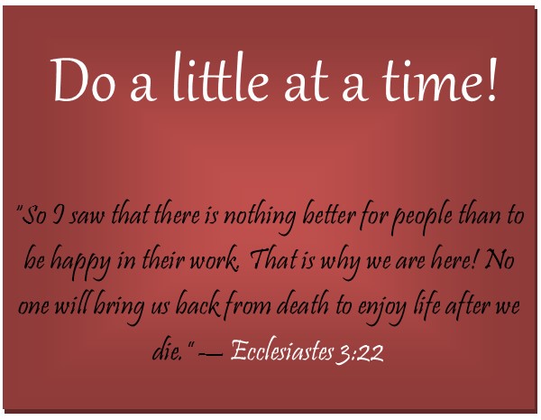 Whether you know this or not, you cannot do it all. If you want to learn to cook, start with the basics. If you want to be in leadership, start with learning how to follow direction. If you want to pastor a church, learn how to first be a parishioner. If you want to open a business, learn how it is done. Yes, you jump head first but that may not work out so well especially when you have bitten off more than you can chew. Do a little at a time until you have mastered that and then add more. Taking on too much can cause injury. You can overwork a muscle, like your jaw muscle, trying to talk yourself out some stuff. You can put too much stress on your organs, like your heart and brain trying to do too much. You can wear yourself out, trying to consistently go when your body is saying not today. Stop trying to do so much. Do a little at a time and then add to it. This way you will actually enjoy what you are working towards instead of it becoming a daunting task you hate. The bible says in Ecclesiastes 2:22-24, “So what do people get in this life for all their hard work and anxiety? Their days of labor are filled with pain and grief; even at night their minds cannot rest. It is all meaningless. So I decided there is nothing better than to enjoy food and drink and to find satisfaction in work. Then I realized that these pleasures are from the hand of God.”