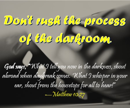 Sometimes God will keep us hidden in order to develop us. Yes, I know you can teach, sing, pray, preach, run a business, lead, take care of a household and will make somebody a great spouse but it isn’t time yet. See, what God is doing is developing you and because He is, you’ve got to sometimes experience being hidden. When film is developed, there is a process.