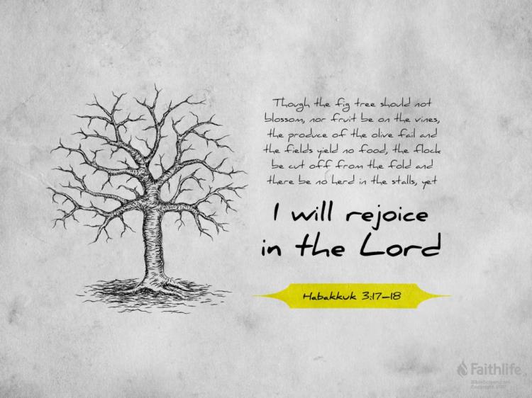 “Even though the fig trees have no blossoms, and there are no grapes on the vines; even though the olive crop fails, and the fields lie empty and barren; even though the flocks die in the fields, and the cattle barns are empty, yet I will rejoice in the LORD! I will be joyful in the God of my salvation! The Sovereign LORD is my strength! He makes me as surefooted as a deer, able to tread upon the heights.”
