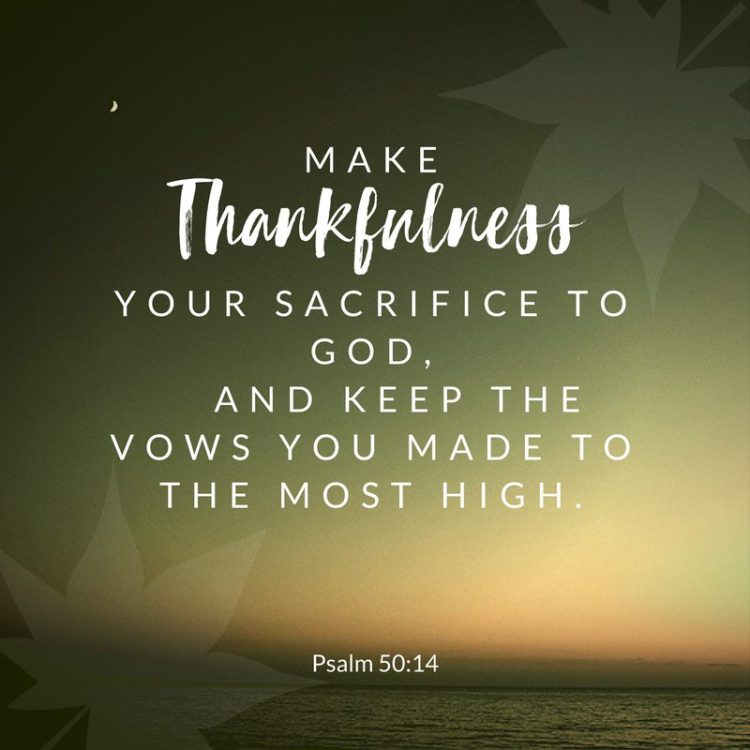 “Sacrifice thank offerings to God, fulfill your vows to the Most High, and call on me in the day of trouble; I will deliver you, and you will honor me.” Psalm 50:14-15