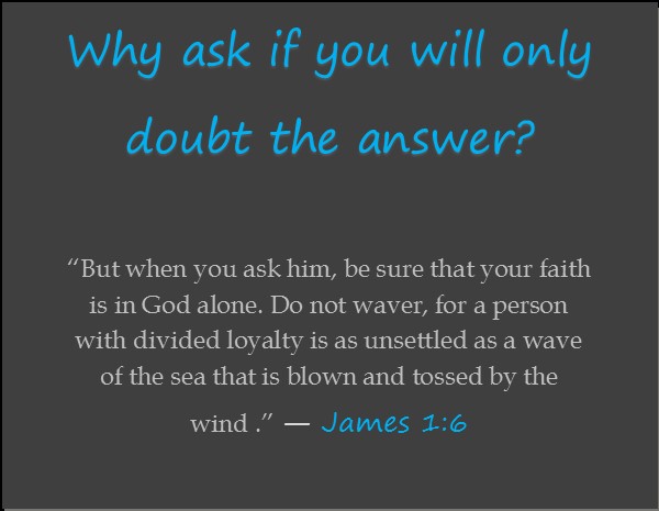 Why even ask? If we don’t trust God to do it, why ask? If we cannot wait in expectancy of when He will do it, why ask? Because God will give us what we ask, in faith and sometimes it isn’t done by our specifications. Sometimes, God will give us things in ways we didn’t expect nor understand. Yet, He still gives us what we asked for. And get this … Sometimes the reason you don’t get exactly what you asked for is because your ask didn’t match your favor. You asked for a 2013 Dodge but your favor has you set to receive a 2018 Mercedes. You asked for a spouse with no children but God sent one with 2, a girl and a boy because what you didn’t foresee is cancer taking away your ability to have any. You ask God to shield you from your enemies but He didn’t because He needed them there to witness the preparation of His table in your honor. Things may not always be done the way you like but it still doesn’t mean it isn’t right. If you can do it better, don’t ask someone else to do it. If nobody can do it to your liking, why ask?